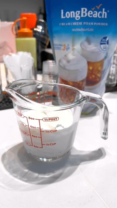 • 1) Hòa Bột Foam Kem Phô Mai LongBeach với nước lạnh hoặc sữa lạnh