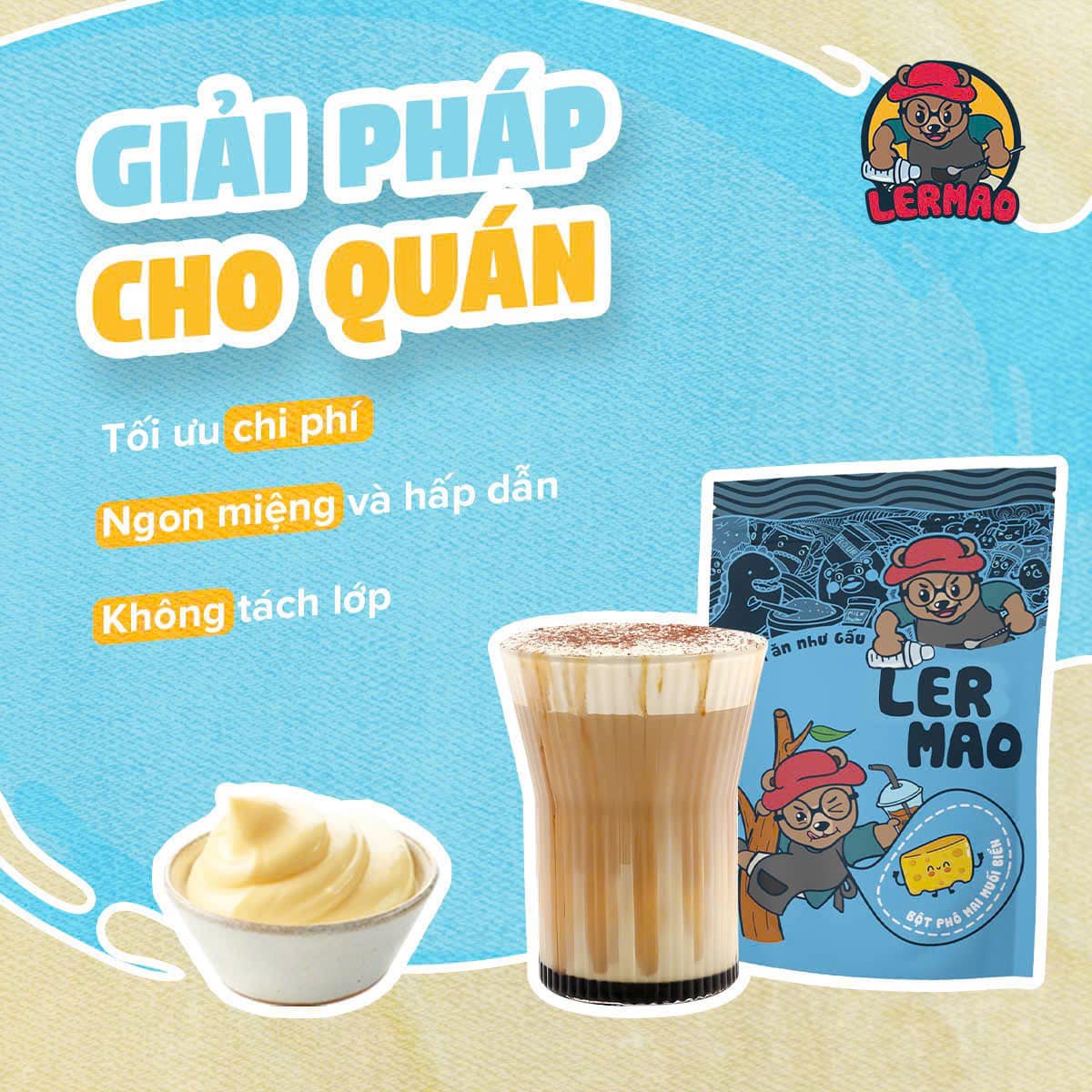 • Kem Cheese Muối Biển LerMao là sản phẩm topping tiện lợi, kết hợp giữa kem cheese mịn béo và muối biển thanh nhẹ, tạo nên hương vị ngọt dịu – mặn mà – thơm ngậy, rất được ưa chuộng trong các món trà sữa, trà trái cây, cà phê,...