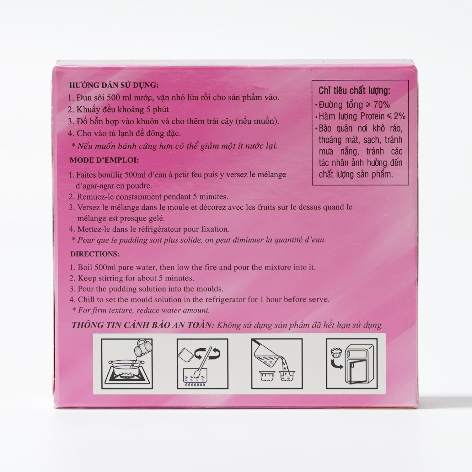 • Lương nước pha : 500ml. Giảm hoặc tăng lượng nước nếu muốn rau câu cứng hay mềm