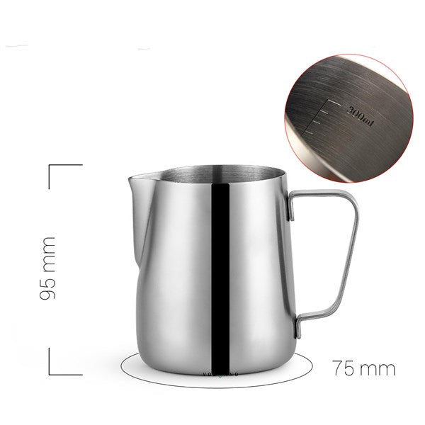 Ca đánh sữa mũi bằng 300ml inox 304 màu bạc, có vạch chia