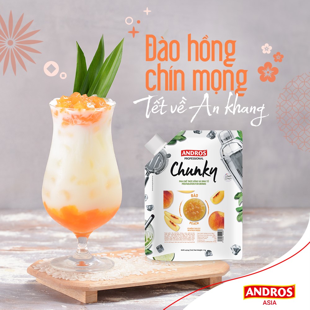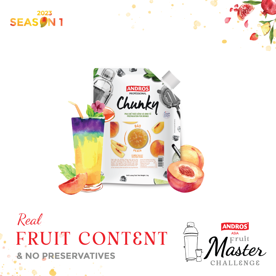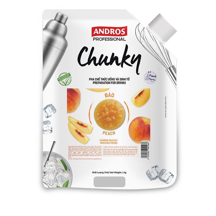 Andros Chunky là nguyên liệu lý tưởng để các chuyên gia pha chế và các quán café có thể thỏa sức sáng tạo ra những thức uống mới. Thành phần topping hoàn hảo mang đến hương vị trái cây tự nhiên từ miếng trái cây thật cho các món nước của bạn. Sản phẩm vẫn giữ trọn vị tươi ngon mà không cần tới chất bảo quản. Hàm lượng trái cây thật trong sản phẩm lên đến 45% - 60% tùy hương vị. Không sử dụng chất cô đặt. Có miếng trái cây thật