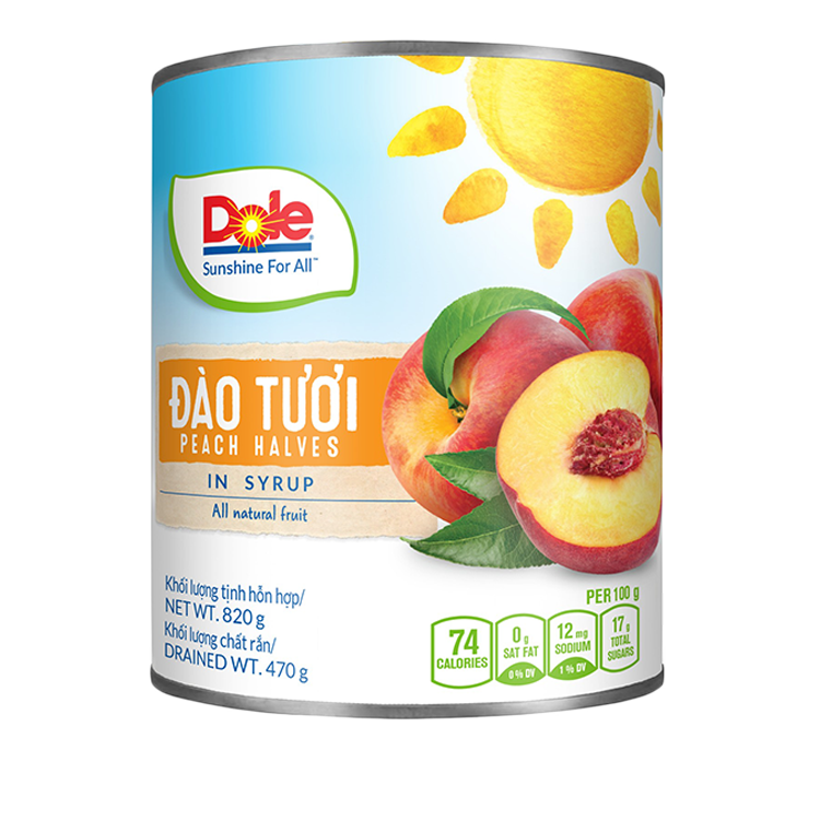Đào tươi đóng lon của Dole được tuyển chọn kỹ càng với từng trái đào tươi ngon nhất để đưa vào sản xuất theo công nghệ khép kín hiện đại. Đào Dole chứa nhiều vitamin A và E, chất xơ và protein tốt cho cơ thể. Sản phẩm được chế biến và ngâm trong nước đường không chứa các hóa chất và chất bảo quản để đàm bảo sức khỏe cho người tiêu dùng. Đào Dole là nguyên liệu tuyệt vời dùng để pha chế trà đào hay các loại nước giải khát, cocktail, làm bánh.