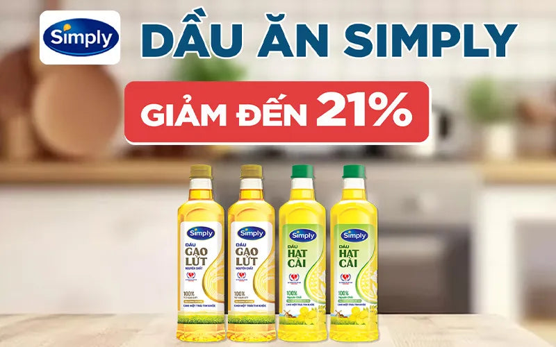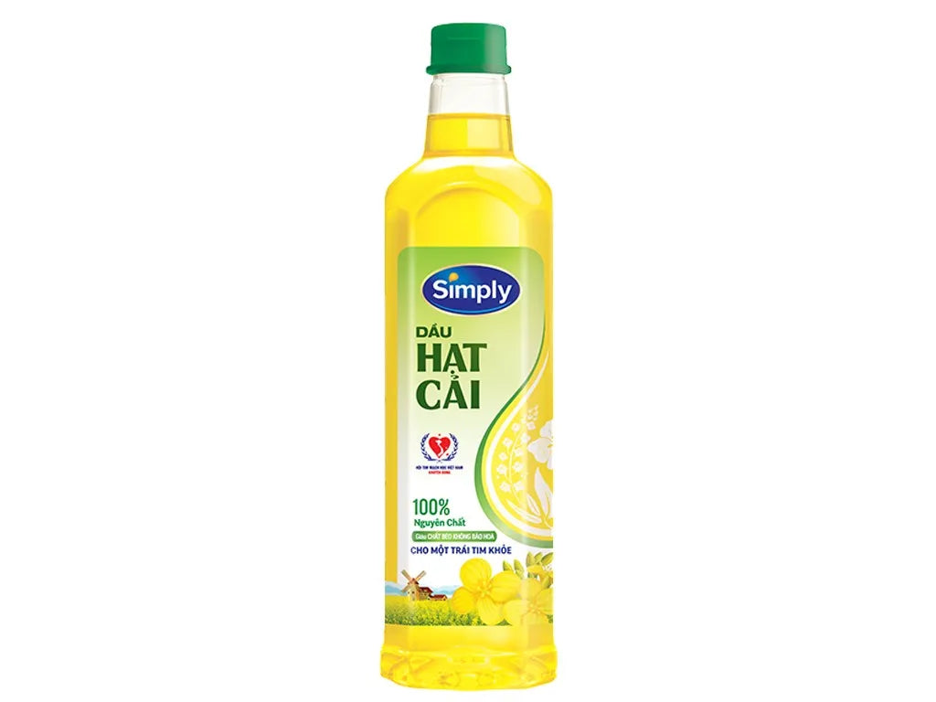 • Dầu hạt cải Simply 1L x 12 chai là một thùng dầu ăn tiện lợi, kinh tế, được làm từ 100% hạt cải nguyên chất, giàu chất béo không bão hòa (Omega 3, 6, 9) và Vitamin E, tốt cho tim mạch, thích hợp cho chiên, xào, trộn salad, làm bánh, và có màu vàng nhạt, vị thanh mát. Quy cách thùng 12 chai 1 lít rất phổ biến cho gia đình và nhà hàng, dễ bảo quản, an toàn cho sức khỏe vì không có chất bảo quản.