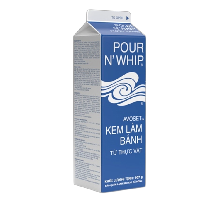 Kem trang trí bánh Pour N Whip 907g  là dòng kem cao cấp dùng để trang trí, làm nhân và phủ trên bề mặt trái cây, kem và bánh mousse. Avoset Pour N’ Whip đã trở thành sự lựa chọn yêu thích cho dòng kem trang trí có nguồn gốc thực vật tại những khách sạn và nhà hàng nổi tiếng. Hiện nay, Avoset Pour N’ Whip được xem như thước đo chuẩn mực cho chất lượng hàng đầu của kem trang trí. Sản phẩm mịn bong, mang vị sữa tự nhiên, giảm thiểu những khó khăn thường gặp khi sử dụng dòng kem có nguồn gốc động vật.