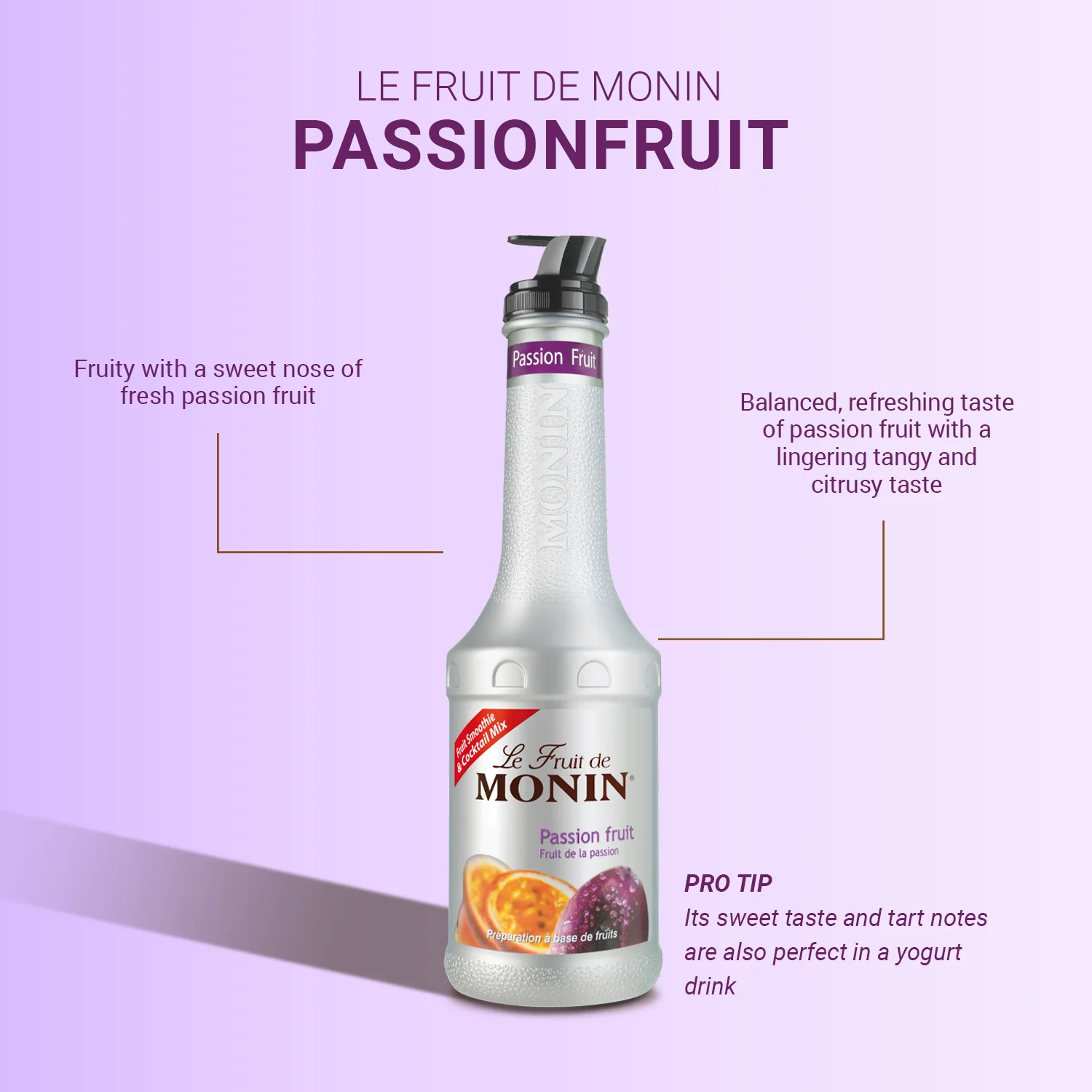 Monin Passion Fruit Puree là lựa chọn thú vị và hấp dẫn cho các doanh nghiệp muốn nâng tầm đồ uống và sáng tạo ẩm thực của mình với hương vị đích thực của trái chanh dây chín. Nâng tầm thực đơn của bạn với hương vị tươi mát và chua chua của chanh dây, thêm hương vị nhiệt đới tuyệt vời cho nhiều loại đồ uống và món ăn ngon.
