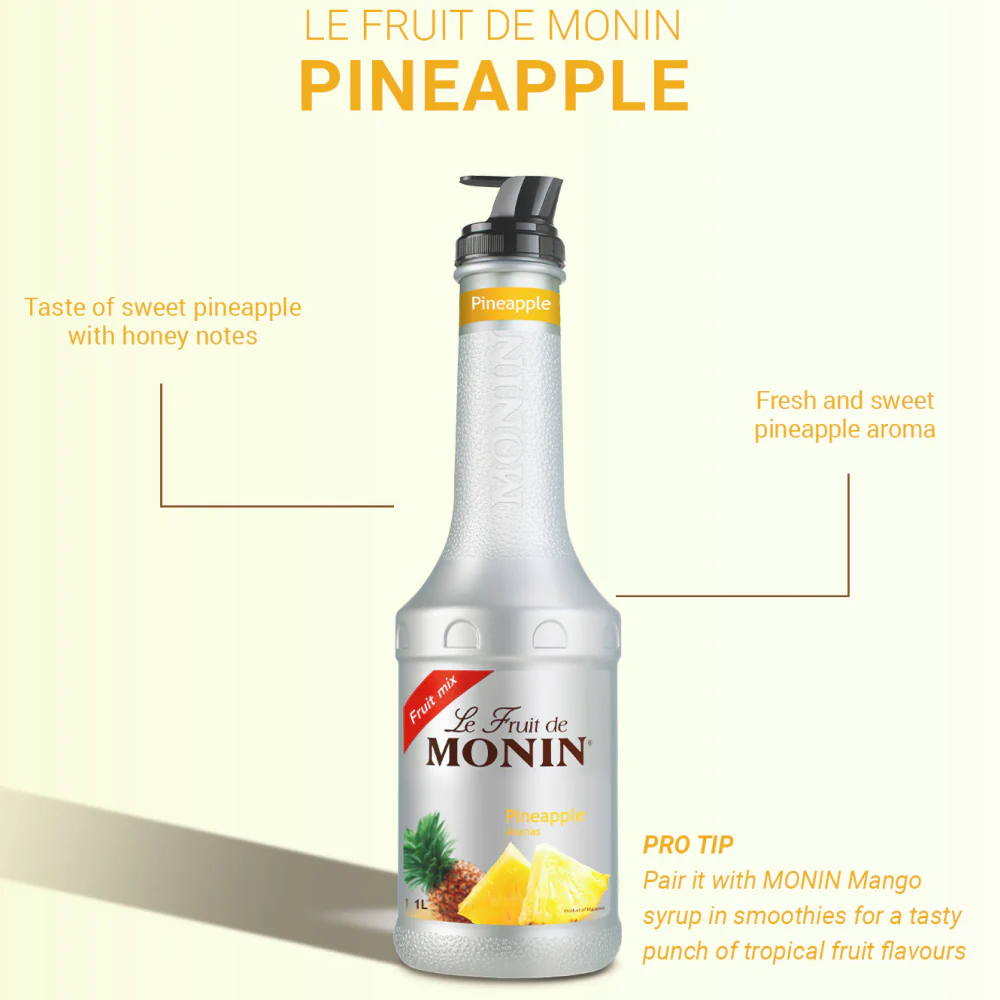 Monin Pineapple Puree được chế biến tỉ mỉ bằng những quả dứa hảo hạng, mang đến trải nghiệm hương vị đích thực đưa bạn đến thiên đường nhiệt đới. Với kết cấu mịn và màu vàng rực rỡ, hỗn hợp này hoàn hảo để thêm hương vị nhiệt đới vào cocktail, mocktail, sinh tố, nước sốt và món tráng miệng.
