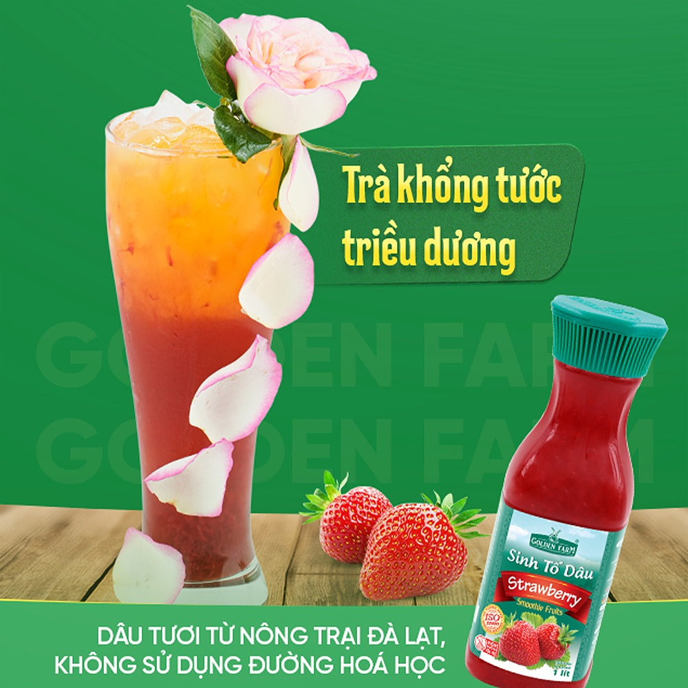 Sinh Tố Dâu Golden Farm (Strawberry Smoothie Base - GF) 1.000 ml Sinh Tố Dâu Golden Farm nổi bật với hương thơm tự nhiên, vị ngọt thanh mát cùng màu sắc bắt mắt, là thành phần không thể thiếu trong pha chế các loại thức uống và món ăn vặt yêu thích của nhiều gia đình.