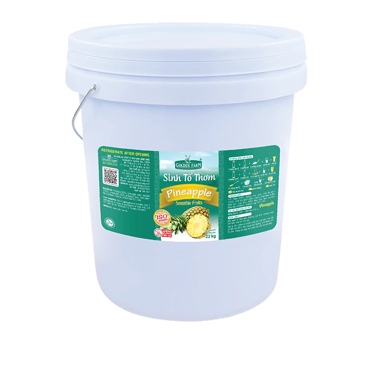 Sinh Tố Thơm - Golden Farm (Pineapple Smoothie Base - Golden Farm) 22kg nổi bật với hương thơm tự nhiên, vị ngọt thanh mát cùng màu sắc bắt mắt, là thành phần không thể thiếu trong pha chế các loại thức uống và món ăn vặt yêu thích của nhiều gia đình.