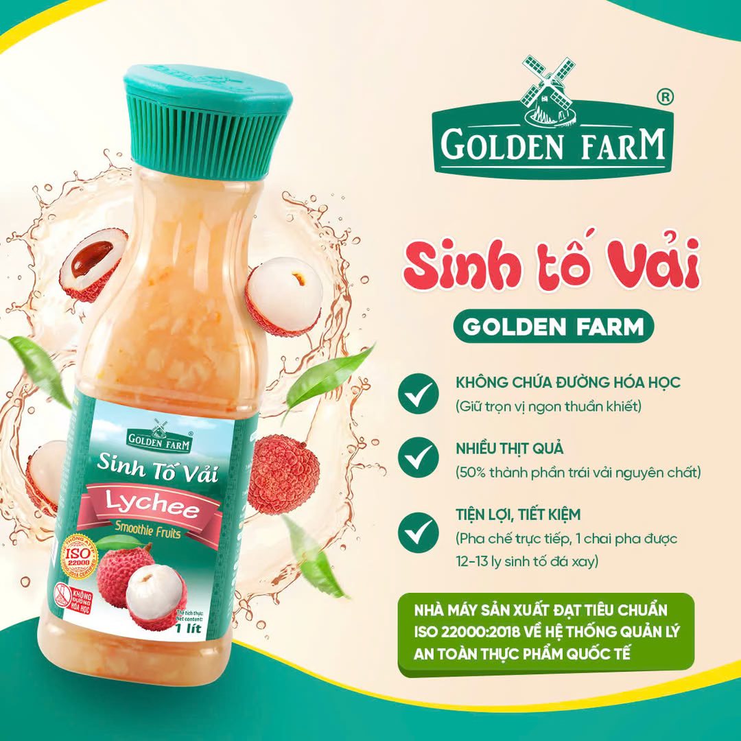 • Sinh Tố Vải Golden Farm nổi bật với hương thơm tự nhiên, vị ngọt thanh mát cùng màu sắc bắt mắt, là thành phần không thể thiếu trong pha chế các loại thức uống và món ăn vặt yêu thích của nhiều gia đình.