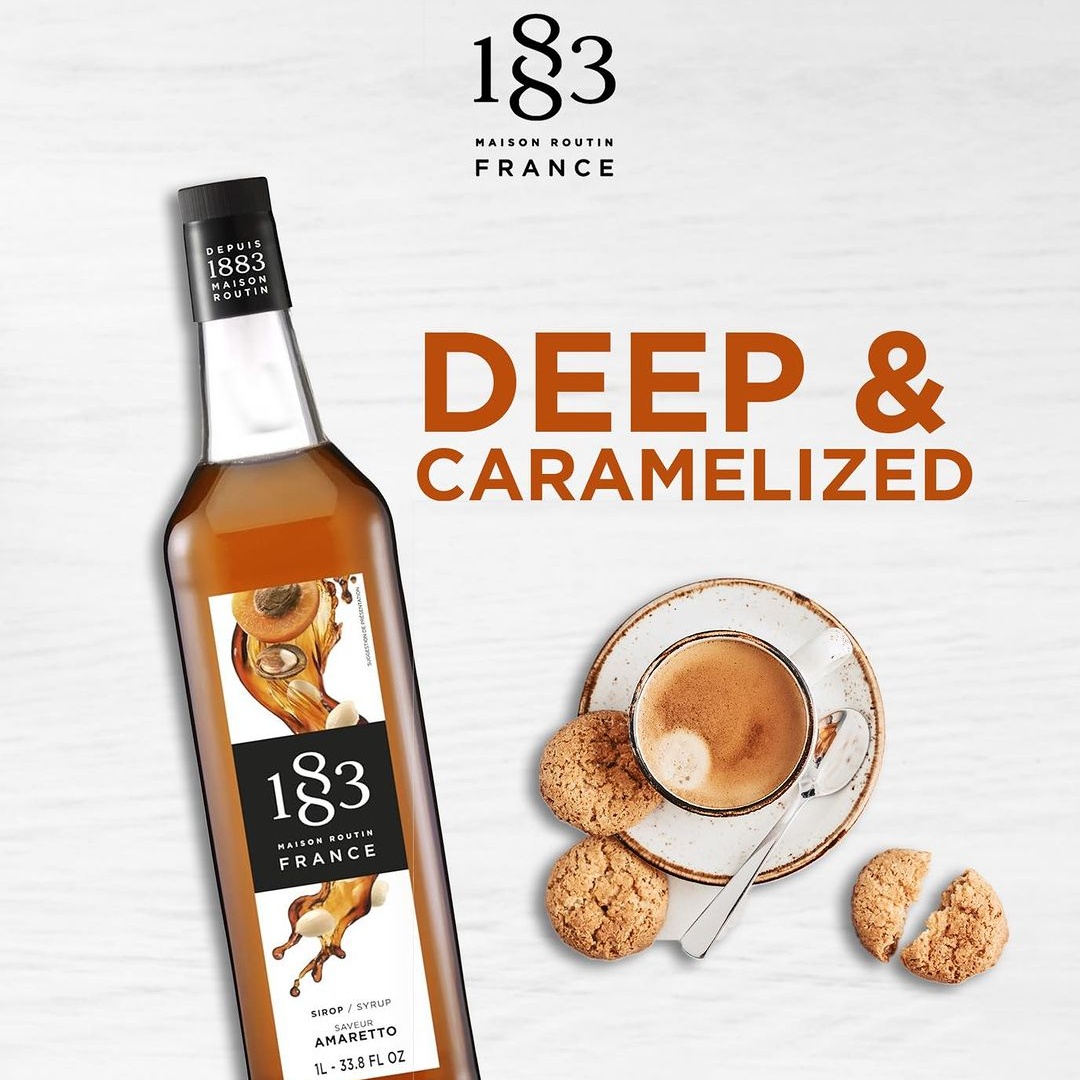 Syrup Amaretto 1883 có màu nâu caramel, lấy cảm hứng từ rượu mùi Amaretto. Không chứa cồn và được làm từ những nguyên liệu được lựa chọn cẩn thận, Syrup Amaretto 1883 bao gồm đường mía nguyên chất và thành phần bí mật là nước Alpine tinh khiết.
