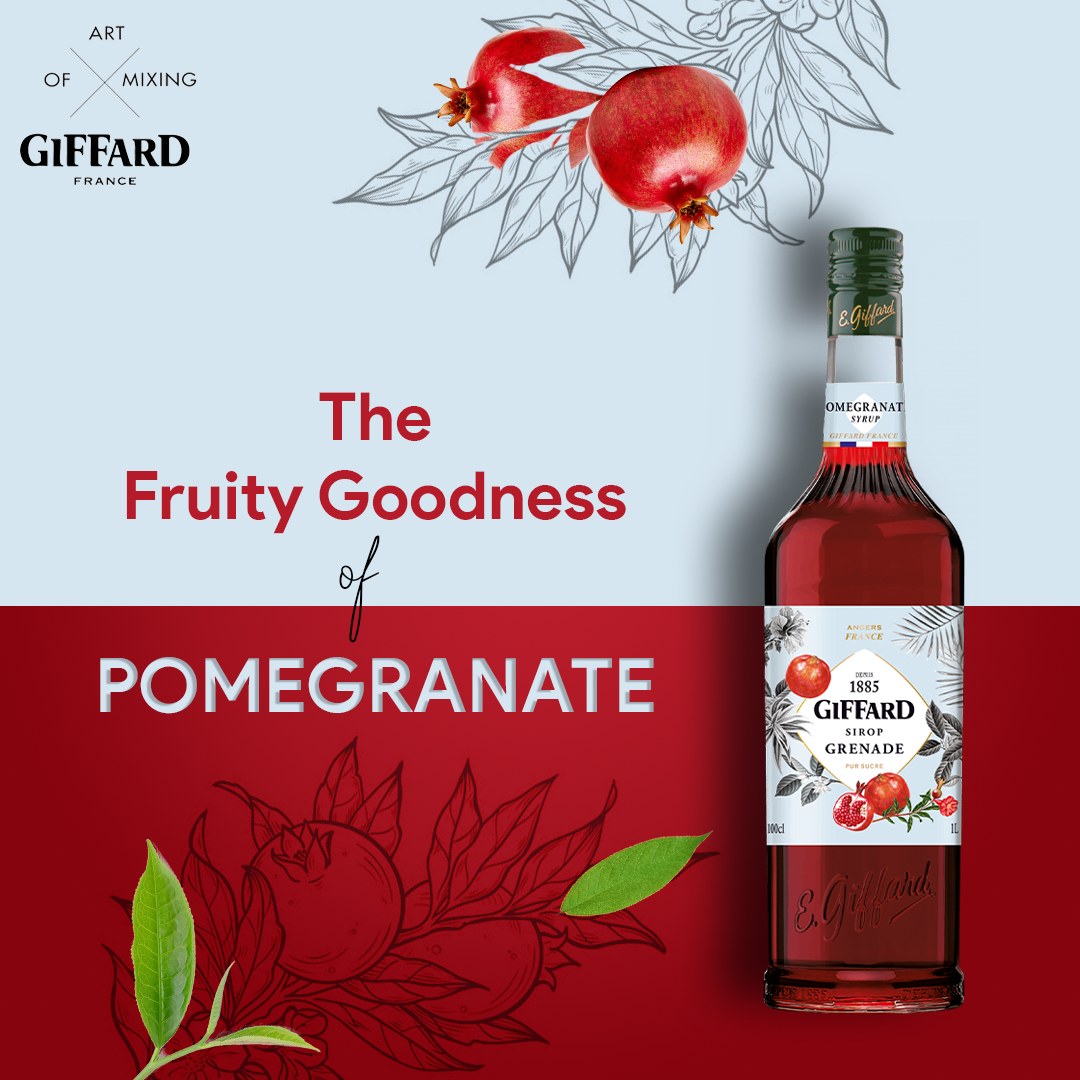 Giffard Pomegranate Syrup (syrup lựu) được làm từ nước ép lựu cô đặc và hương thơm tự nhiên của lựu. Syrup có độ chát nhẹ và độ chua đặc trưng của quả lựu. Giffard Pomegranate Syrup nguyên chất được làm từ nước ép lựu cô đặc kết hợp với đường tinh luyện chiết xuất từ củ cải đường. Hương vị ngọt ngào của trái cây và độ chua đặc trưng tạo nên một hương vị riêng biệt.