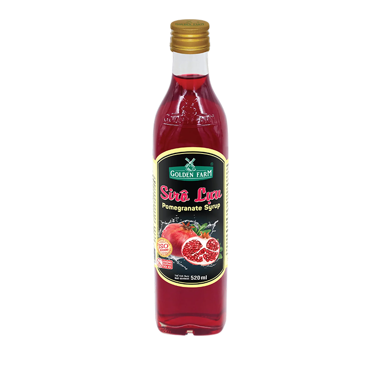 Syrup Golden Farm Lựu (Pomegranate Syrup) 520 ml nổi bật với hương thơm tự nhiên, hậu ngọt thanh, giúp tăng thêm vị ngon tuyệt hảo cho các món thức uống và nhiều món tráng miệng khác.