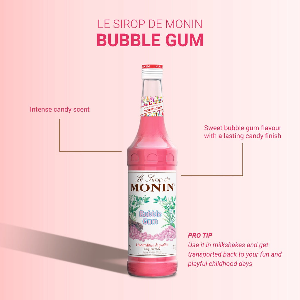 Với Syrup Monin Bubble Gum 700ml, bạn có thể nhận ra ngay hương vị của mùi kẹo dẻo, bông gòn, mùi của kẹo Bigbabol lan tỏa trong khoang miệng trong những ly đồ uống. Mang hương vị tự nhiên trong từng món đồ uống siro Monin Kẹo Cao Su như là bản sao hoàn chỉnh của những viên kẹo này. Để cho những ly đồ uống như soda, cocktail trở nên đặc biệt với màu sắc thanh nhã hấp dẫn hay những ly trà, cà phê thì chỉ cần một vài giọt cũng làm hương vị của ly đồ uống trở nên thú vị hơn đó.
