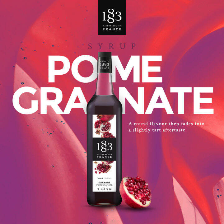 Với hương thơm kỳ lạ của trái cây và hoa cam quýt, Syrup Pomegranate (Quả Lựu) 1883 1L có hương thơm nồng nàn của trái cây và nho màu đỏ. Hương vị hơi ngọt của nó kết hợp hương vị của trái cây giòn, đất với hương vị của rượu vang đỏ khô. Siro lựu 1883 được làm từ những nguyên liệu được lựa chọn kỹ càng bao gồm đường mía tự nhiên và thành phần bí mật của chúng tôi là nước Alpine tinh khiết.