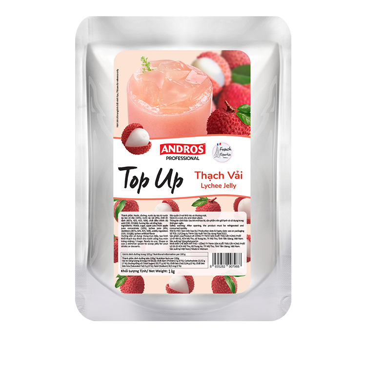 ANDROS Top Up Thạch trái cây là dòng sản phẩm topping, nguyên liệu phục vụ cho ứng dụng ngành F&B. Được làm từ nước ép trái cây tự nhiên, sản phẩm có cấu trúc thạch mềm mượt tạo sự vui miệng và lớp màu bắt mắt cho món nước. Đây là Thạch topping trái cây hoàn hảo mang lại trải nghiệm mới, sự sáng tạo cho các chuyên gia và tính cải tiến cho thực đơn của bạn.